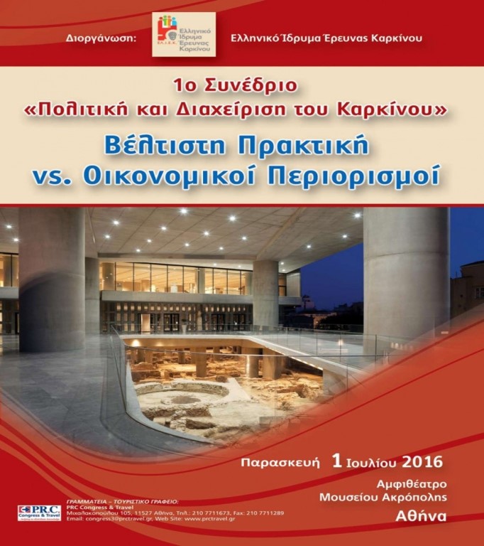 Η καταγραφή της κατάστασης στη χώρα μας, αλλά και η αναζήτηση λύσεων αποτέλεσε το αντικείμενο του 1ου Συνεδρίου «Πολιτική και Διαχείριση του Καρκίνου- Βέλτιστη Πρακτική VS Οικονομικοί Περιορισμοί» το οποίο πραγματοποιήθηκε την Παρασκευή 1η Ιουλίου 2016 στο Αμφιθέατρο του Μουσείου Ακρόπολης.