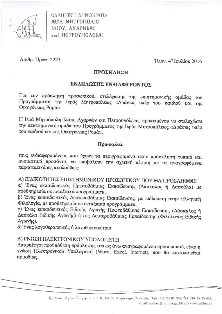 Η Ιερά Μητρόπολη Ιλίου, Αχαρνών και Πετρουπόλεως, προκειμένου να στελεχώσει την επιστημονική ομάδα του Προγράμματος της Ιεράς Μητροπόλεως «Δράσεις υπέρ του παιδιού και της Οικογένειας Ρομά»,