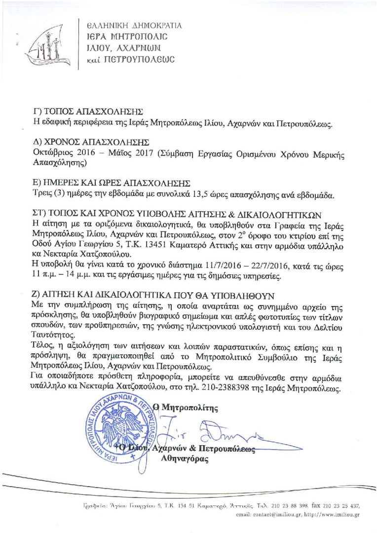 Τέλος, η αξιολόγηση των αιτήσεων και λοιπών παραστατικών, όπως επίσης και η πρόσληψη, θα πραγματοποιηθεί από το Μητροπολιτικό Συμβούλιο της Ιεράς Μητροπόλεως Ιλίου, Αχαρνών και Πετρουπόλεως.