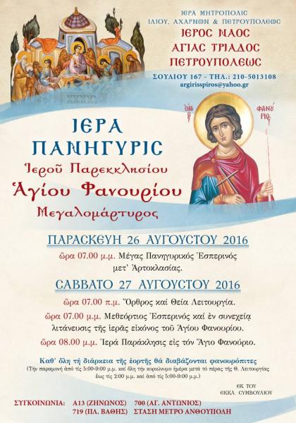 Πανηγυρίζει το παρεκκλήσιο του Ι.Ν. Αγίας Τριάδας Πετρουπόλεως, το οποίο τιμάται στη μνήμη του Αγίου Φανουρίου του μεγαλομάρτυρος, στις 26 και 27 Αυγούστου 2016.