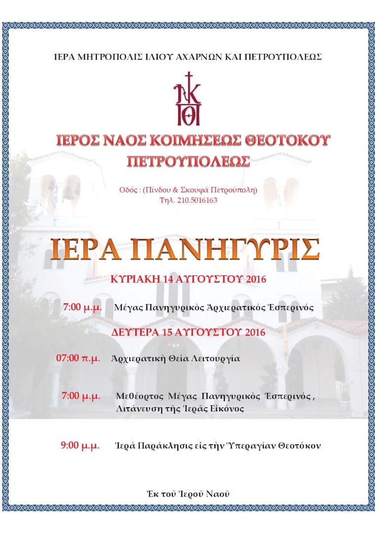 Πανηγυρίζει ο Ιερός Ναός Κοιμήσεως Θεοτόκου Πετρουπόλεως, σύμφωνα με το εξής πρόγραμμα: