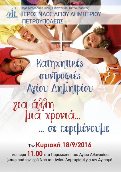 Με τον Αγιασμό θα ξεκινήσουν τις συγκεντρώσεις τους οι κατηχητικές συντροφιές του Αγίου Δημητρίου Πετρουπόλεως, την Κυριακή 18 Σεπτεμβρίου 2016, στις 11:00!