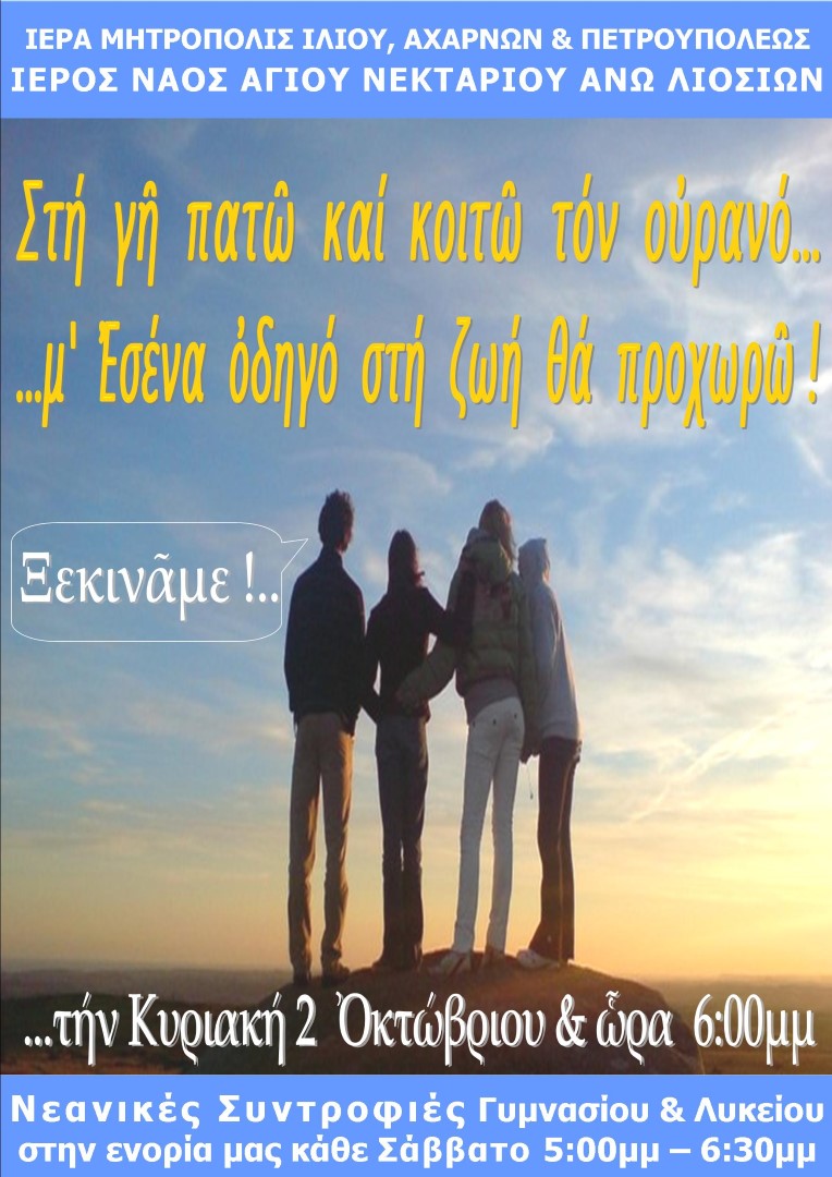 Την Κυριακή 2 Οκτωβρίου 2016 ξεκινούν με την τέλεση του Αγιασμού οι κατηχητικές συνάξεις και οι νεανικές συντροφιές του Ιερού Προσκυνηματικού Ναού Αγίου Νεκταρίου Άνω Λιοσίων.