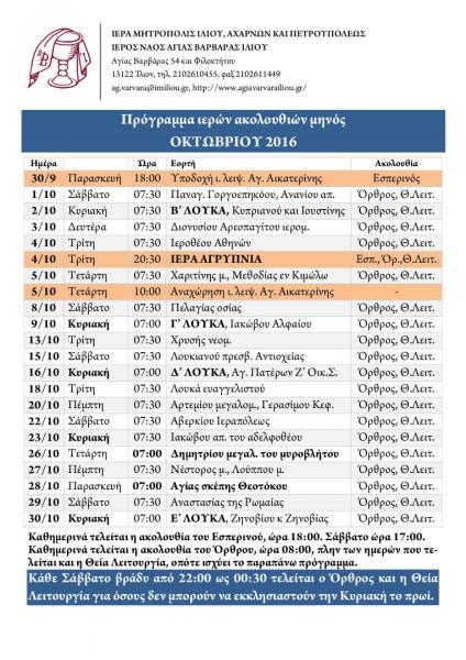 Δείτε το πρόγραμμα των ακολουθιών του Ι.Ν. Αγ. Βαρβάρας Ιλίου για το μήνα Οκτώβριο 2016.