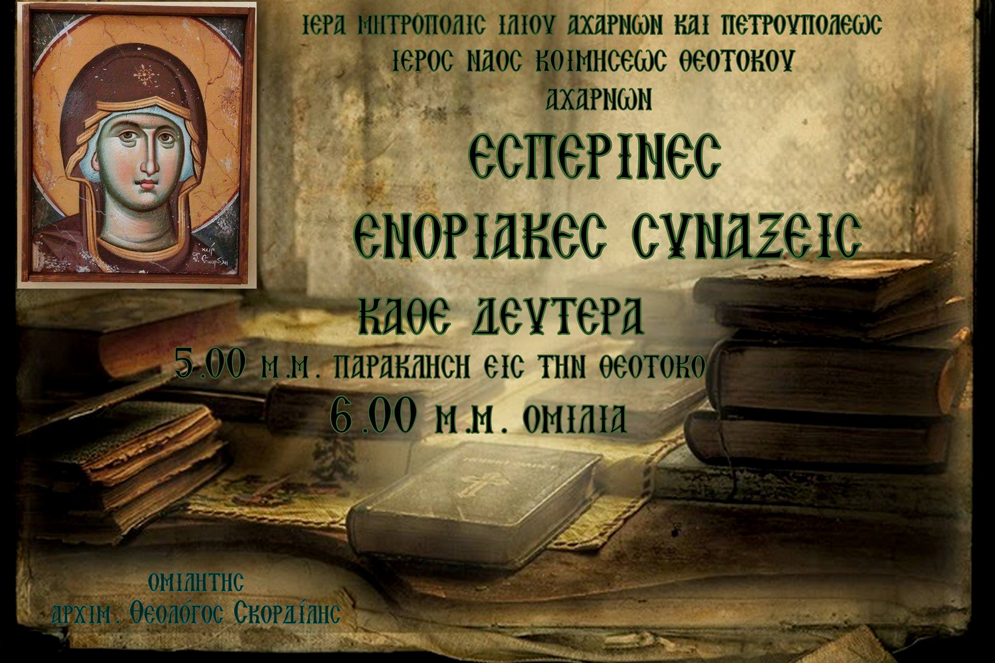 6.00 μ.μ. Ομιλία από τον εφημέριο του Ναού, Αρχίμ. Θεολόγο Σκορδίλη.