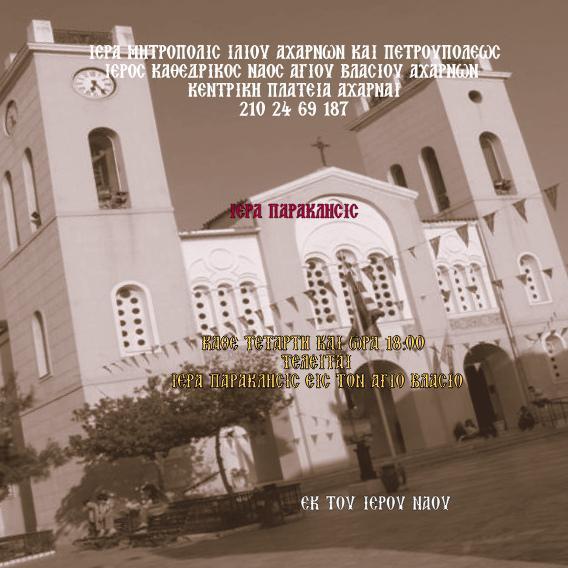Ιερά παράκληση στην Υπεραγία Θεοτόκο θα τελείται κάθε Τετάρτη στον Ι.Ν. Αγ. Βλασίου Αχαρνών, καθ' όλο το Εκκλησιαστικό έτος 2016-2017.