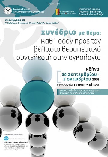 Πραγματοποιήθηκε στις 30 Σεπτεμβρίου – 2 Οκτωβρίου 2016 στο Ξενοδοχείο Crowne Plaza, στην Αθήνα,το συνέδριο με θέμα: «Καθ’ οδόν προς τον βέλτιστο θεραπευτικό συντελεστή στην ογκολογία» που διοργανώθηκε από την Ελληνική Εταιρεία Ακτινοθεραπευτικής Ογκολογίας και την Επιστημονική Εταιρεία «Καρκίνος, Εκπαίδευση, Έρευνα & Κλινική Πράξη» σε συνεργασία με την A’ Παθολογική Ογκολογική κλινική Γ.Α.Ο.Ν.Α. “Άγιος Σάββας”.
