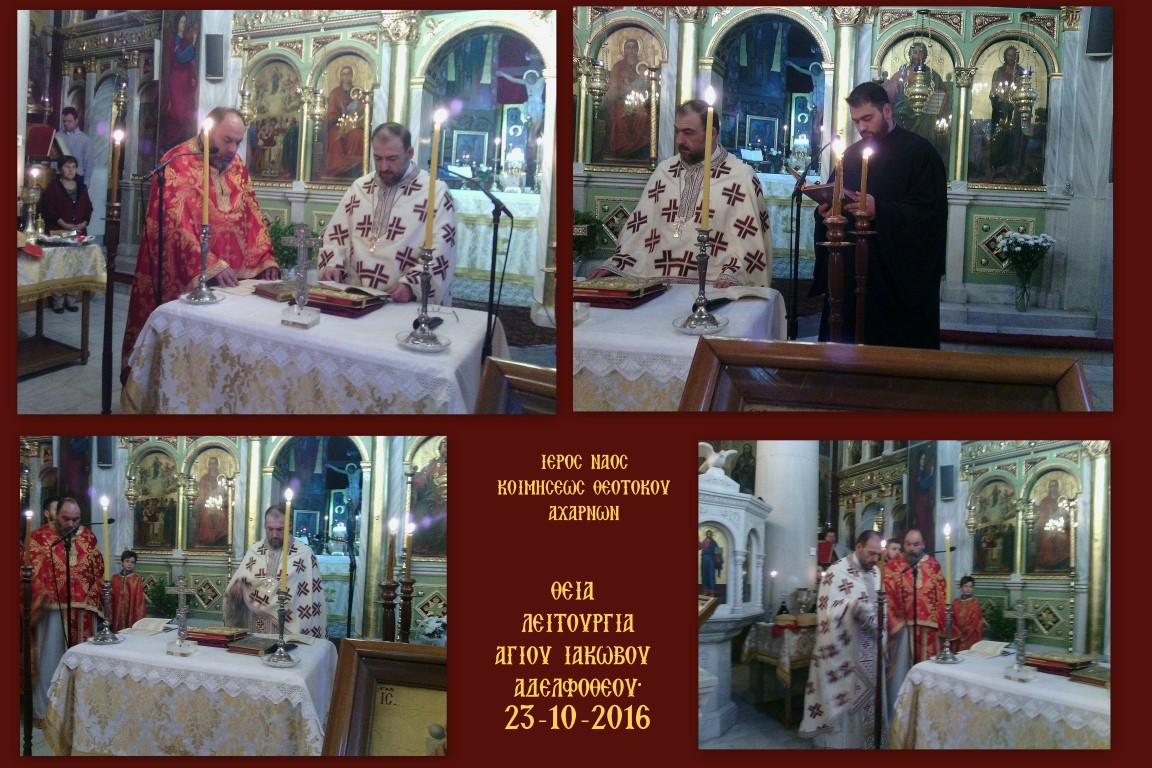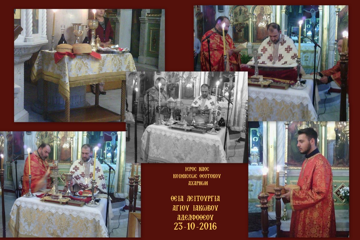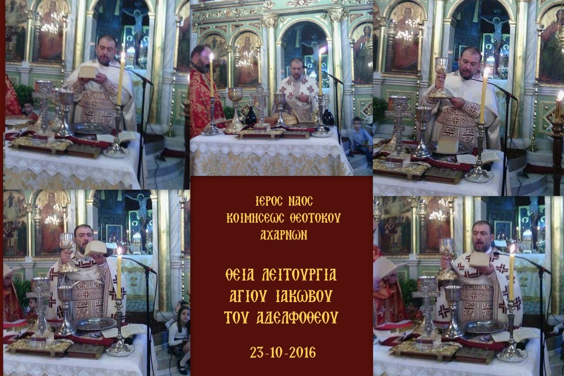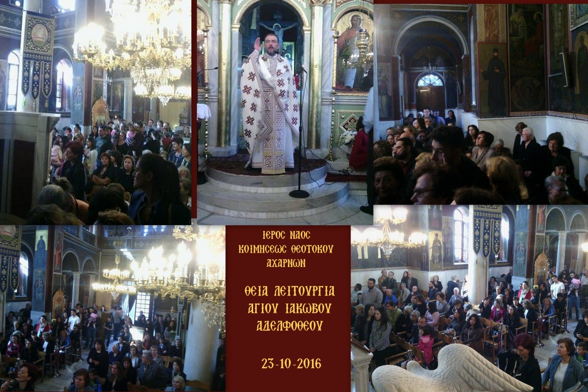 Την Κυριακή 23 Οκτωβρίου 2016 τελέστηκε στον Ι.Ν. Κοιμήσεως Θεοτόκου Αχαρνών η αρχαιοπρεπής Θεία Λειτουργία που αποδίδεται στον Άγιο Ιάκωβο τον Αδελφόθεο.