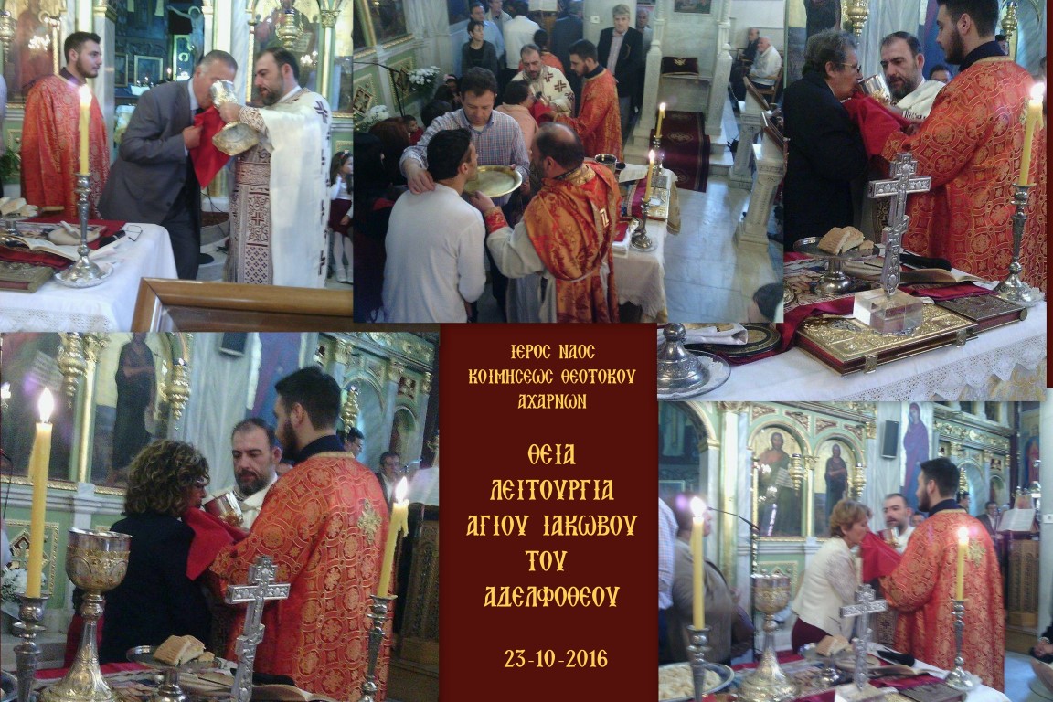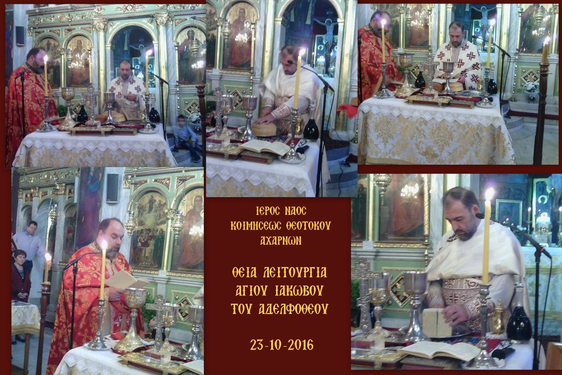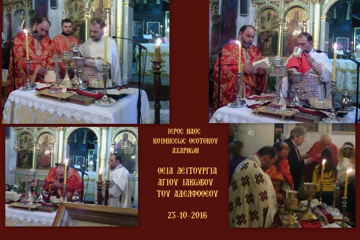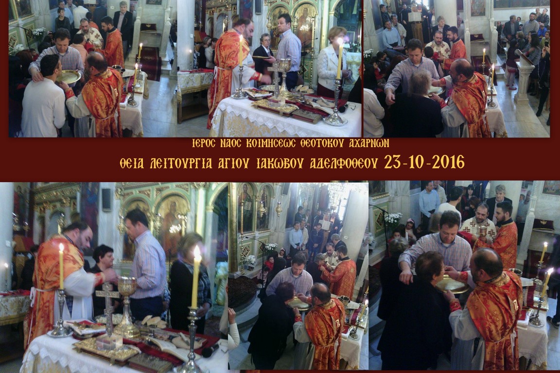 Την Κυριακή 23 Οκτωβρίου 2016 τελέστηκε στον Ι.Ν. Κοιμήσεως Θεοτόκου Αχαρνών η αρχαιοπρεπής Θεία Λειτουργία που αποδίδεται στον Άγιο Ιάκωβο τον Αδελφόθεο.