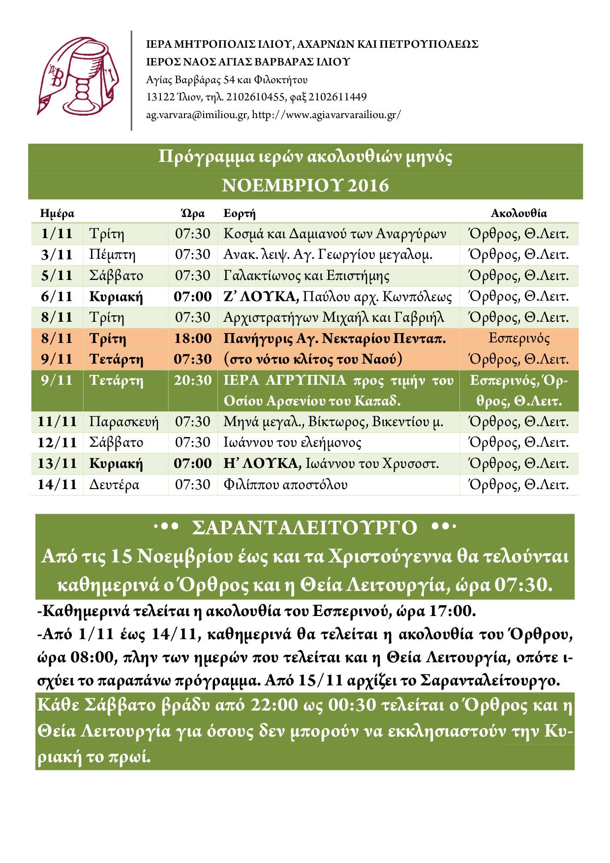 Δείτε το πρόγραμμα των ακολουθιών του Ι.Ν. Αγ. Βαρβάρας Ιλίου για το μήνα Νοέμβριο 2016.