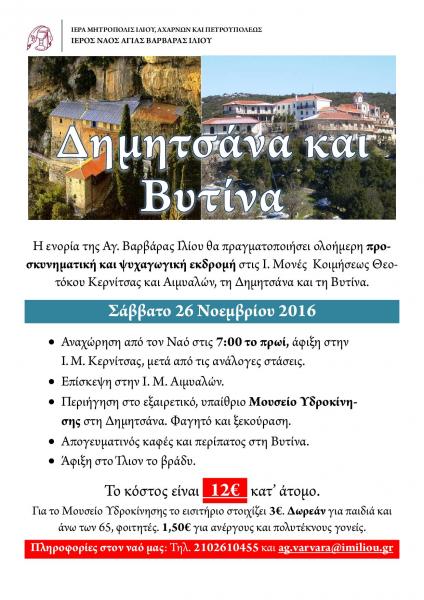 Η ενορία της Αγ. Βαρβάρας Ιλίου θα πραγματοποιήσει ολοήμερη προσκυνηματική και ψυχαγωγική εκδρομή στις Ι. Μονές Κοιμήσεως Θεοτόκου Κερνίτσας και Αιμυαλών, τη Δημητσάνα και τη Βυτίνα.