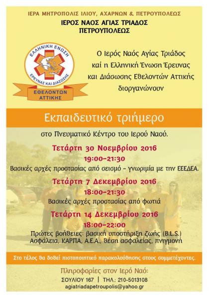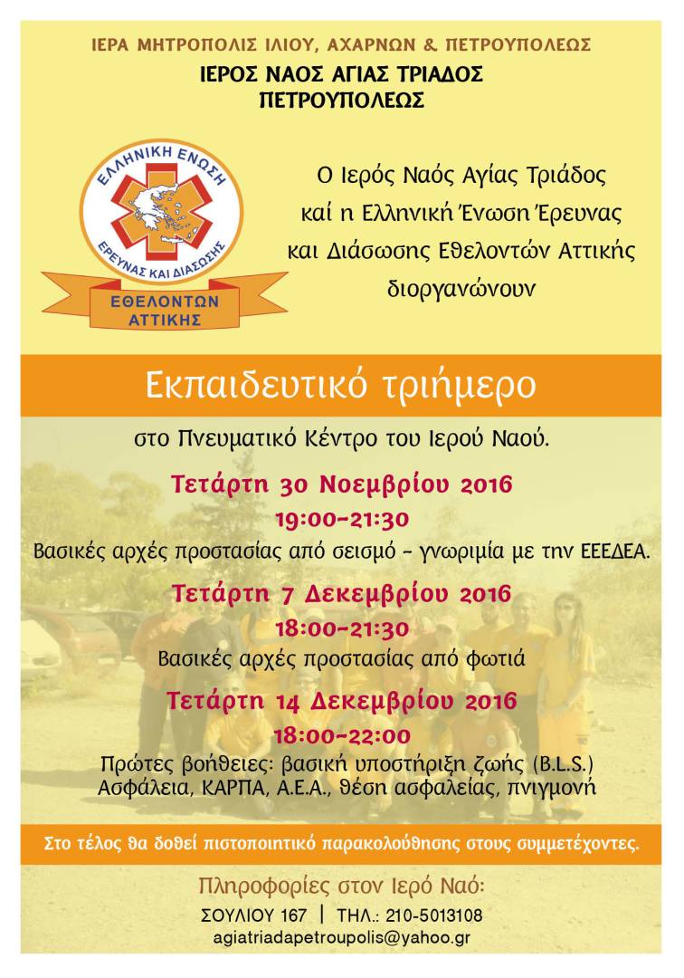 Ο Ιερός Ναός Αγίας Τριάδας Πετρουπόλεως και η Ελληνική Ένωση Έρευνας και Διάσωσης Εθελοντών Αττικής διοργανώνουν τρεις εκπαιδεύσεις προς όλους τους ενδιαφερόμενους, σχετικά με τα εξής: