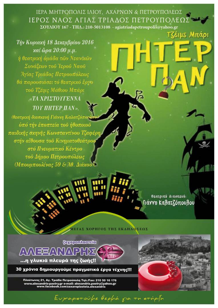 Την Κυριακή 18 Δεκεμβρίου 2016 και ώρα 20:00, η θεατρική ομάδα των Νεανικών Συνάξεων του Ι.Ν. Αγ. Τριάδας Πετρουπόλεως, θα παρουσιάσει το θεατρικό έργο του Τζέιμς Μάθιου Μπάριου με τίτλο «Τα Χριστούγεννα του Πήτερ Πάν», σε θεατρική διασκευή του Γιάννη Καλατζόπουλου.