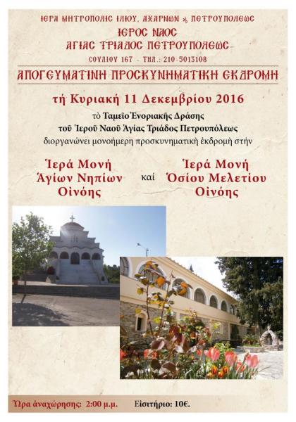 Απογευματινή προσκυνηματική εκδρομή διοργανώνει το Ταμείο Ενοριακής Δράσης του Ι.Ν. Αγίας Τριάδας Πετρουπόλεως, την Κυριακή 11 Δεκεμβρίου 2016.