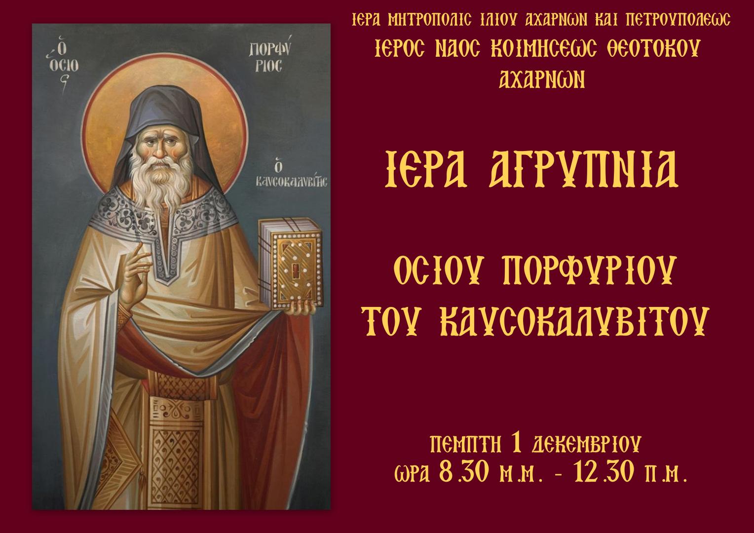 Ιερά αγρυπνία επί τη μνήμη του Οσίου Πορφυρίου του Καυσοκαλυβίτου θα τελεστεί στον Ιερό Ναό Κοιμήσεως Θεοτόκου Αχαρνών την Πέμπτη 1 Δεκεμβρίου 2016.