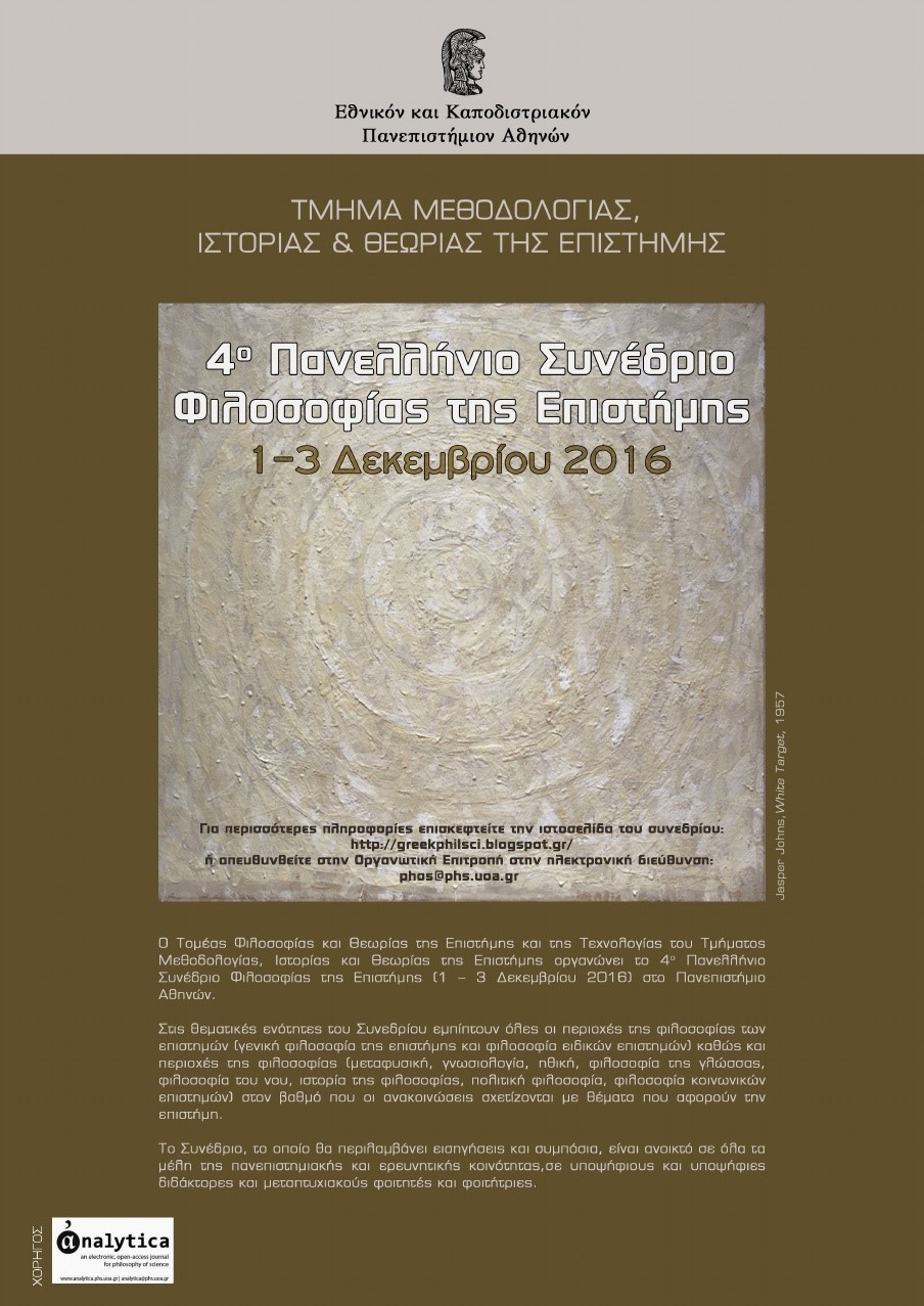 Ο Τομέας Φιλοσοφίας και Θεωρίας της Επιστήμης και της Τεχνολογίας του Τμήματος Μ.Ι.Θ.Ε. του Εθνικού και Καποδιστριακού Πανεπιστημίου Αθηνών διοργάνωσε το 4ο Πανελλήνιο Συνέδριο Φιλοσοφίας της Επιστήμης στις 1-3 Δεκεμβρίου 2016.