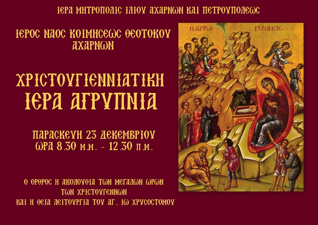Ιερά Αγρυπνία θα τελεστεί την Παρασκευή 23 Δεκεμβρίου 2016, από τις 20:30-00:30, στον Ιερό Ναό Κοιμήσεως Θεοτόκου Αχαρνών.