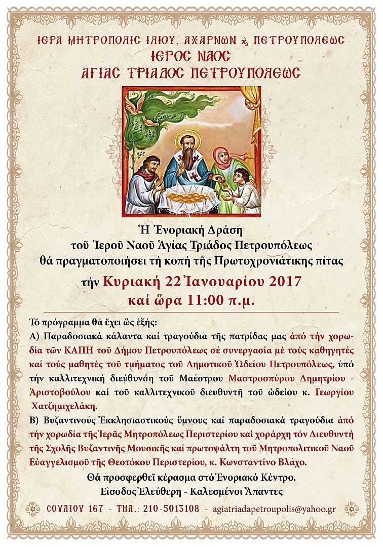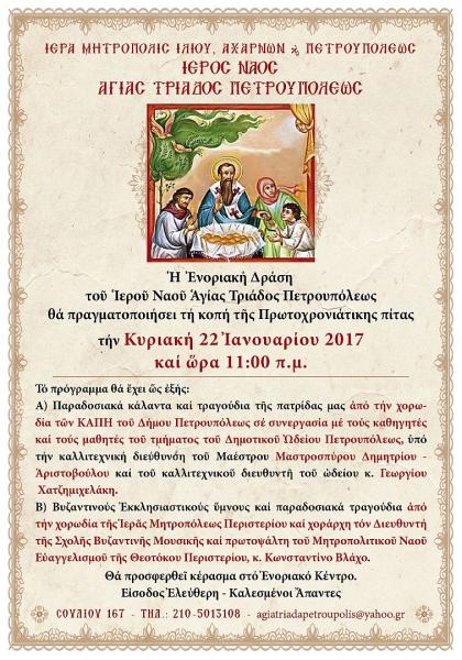 Το Ταμείο Ενοριακής Δράσης του Ι.Ν. Αγ. Τριάδας Πετρουπόλεως θα πραγματοποιήσει την κοπή της Πρωτοχρονιάτικης πίτας την Κυριακή 22 Ιανουαρίου 2017 και ώρα 11 π.μ.