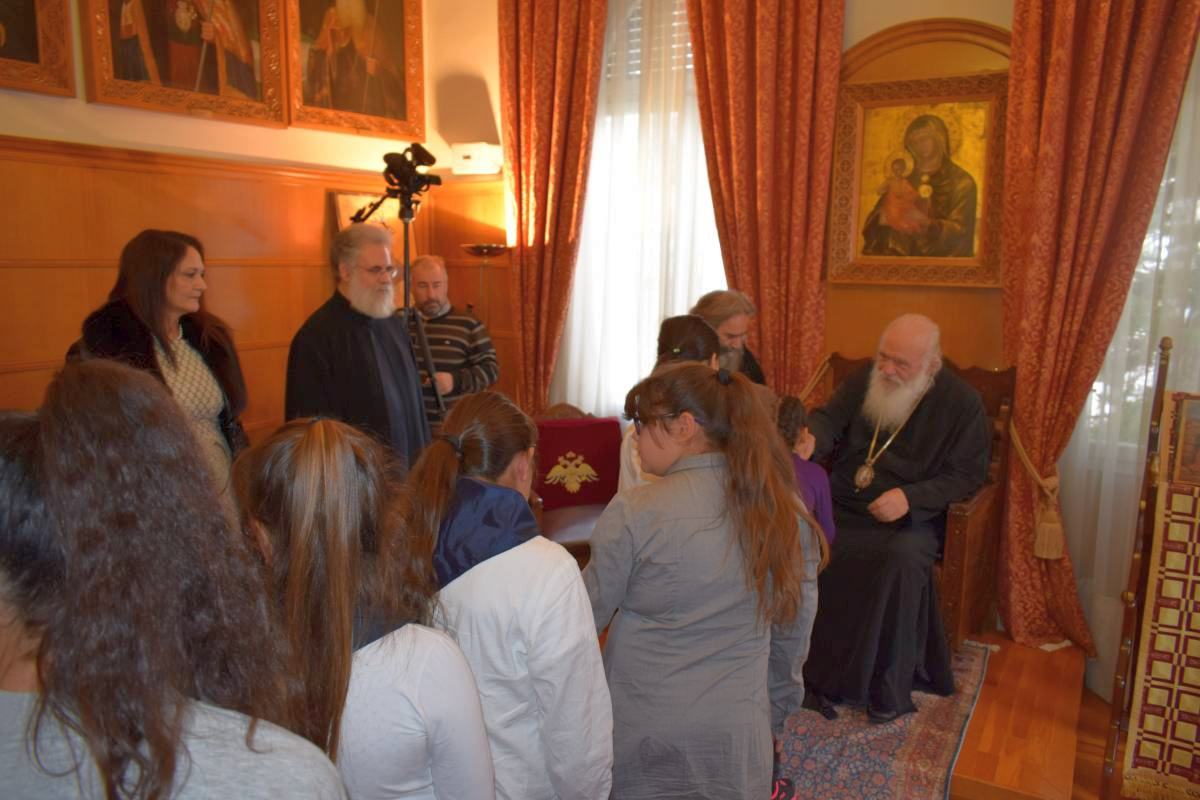 Με τη συνοδεία του Σεβασμιωτάτου Μητροπολίτου Ιλίου, Αχαρνών και Πετρουπόλεως και των δασκάλων τους, τα παιδιά του Δημοτικού Σχολείου της περιοχής του καταυλισμού του Στρατοπέδου ΚΑΠΟΤΑ στις Αχαρνές, επισκέφθηκαν τον Μακαριώτατο Αρχιεπίσκοπο Αθηνών και πάσης Ελλάδος κ. Ιερώνυμο για να ψάλλουν τα κάλαντα.