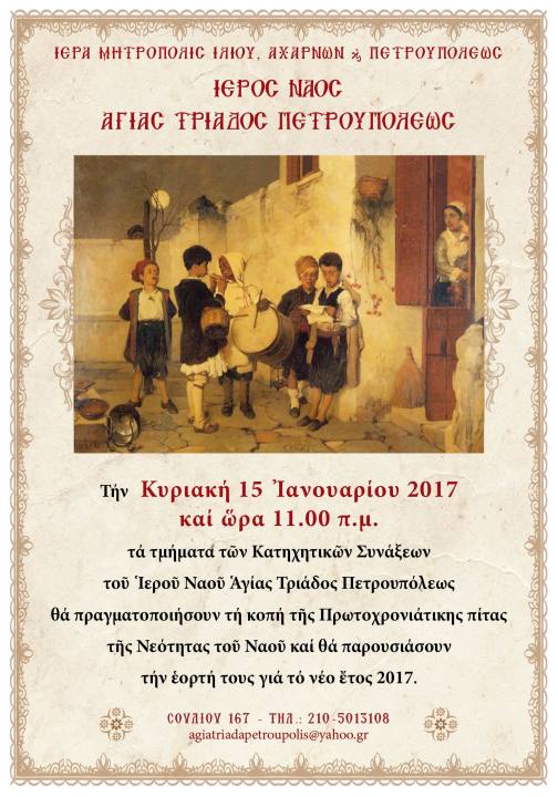 Την Κυριακή 15 Ιανουαρίου 2017 και ώρα 11:00, τα τμήματα των Κατηχητικών Συνάξεων του Ιερού Ναού Αγ. Τριάδας Πετρουπόλεως θα πραγματοποιήσουν την κοπή της Πρωτοχρονιάτικης πίτας της Νεότητας του Ναού και θα παρουσιάσουν την εορτή τους για το νέο έτος 2017.