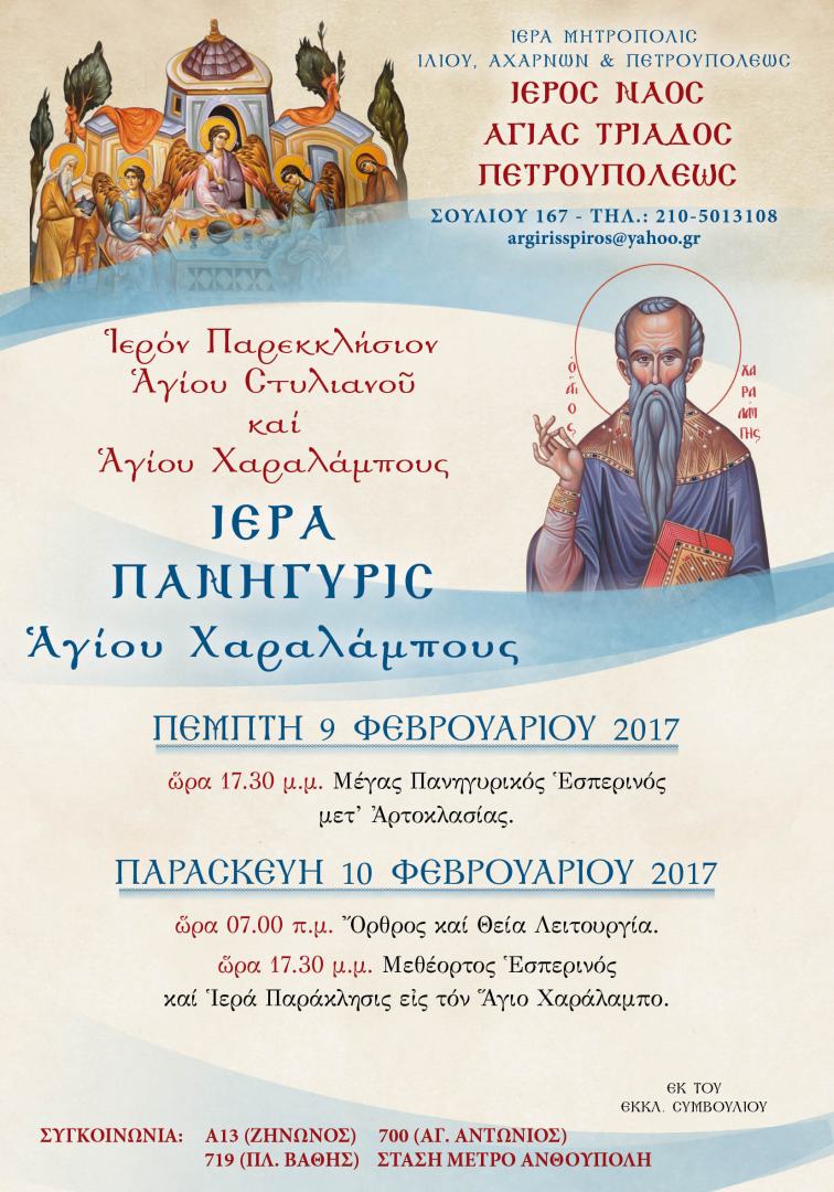 Πανηγυρίζει το ιερό παρεκκλήσιο του Αγ. Χαραλάμπους στον Ι.Ν. Αγ. Τριάδας Πετρουπόλεως, σύμφωνα με το ακόλουθο πρόγραμμα: