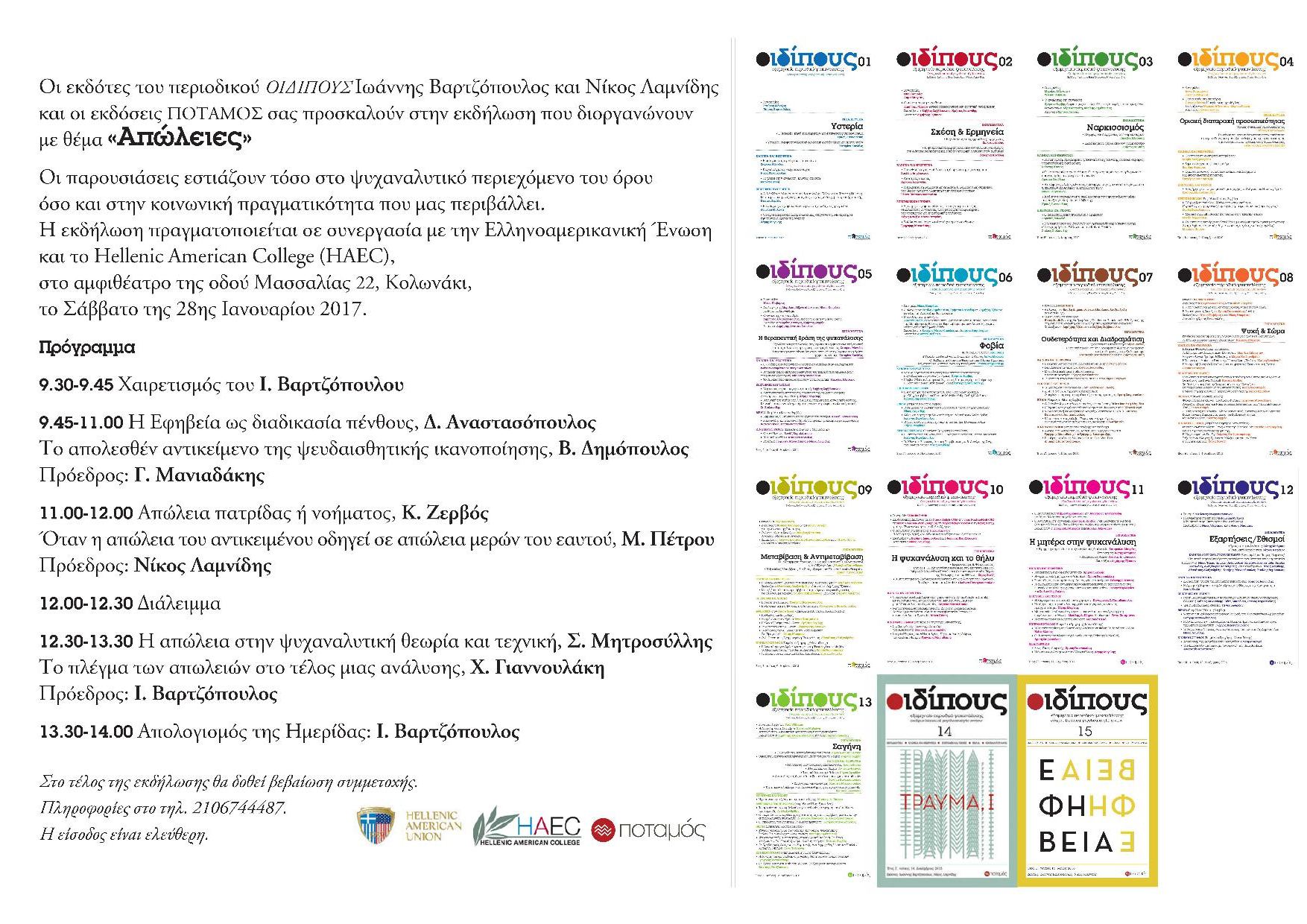 Πραγματοποιήθηκε η Ημερίδα με θέμα «ΑΠΩΛΕΙΕΣ ΚΑΙ ΨΥΧΑΝΑΛΥΣΗ» που διοργανώθηκε από την Ελληνοαμερικανική Ένωση, το ψυχαναλυτικό περιοδικό «Οιδίπους» και τις εκδόσεις Ποταμός, σε συνεργασία με την Ελληνοαμερικανική Ένωση και το Hellenic American College, και πραγματοποιήθηκε το Σάββατο 28 Ιανουαρίου στο αμφιθέατρο του Hellenic American College στο Κολωνάκι.