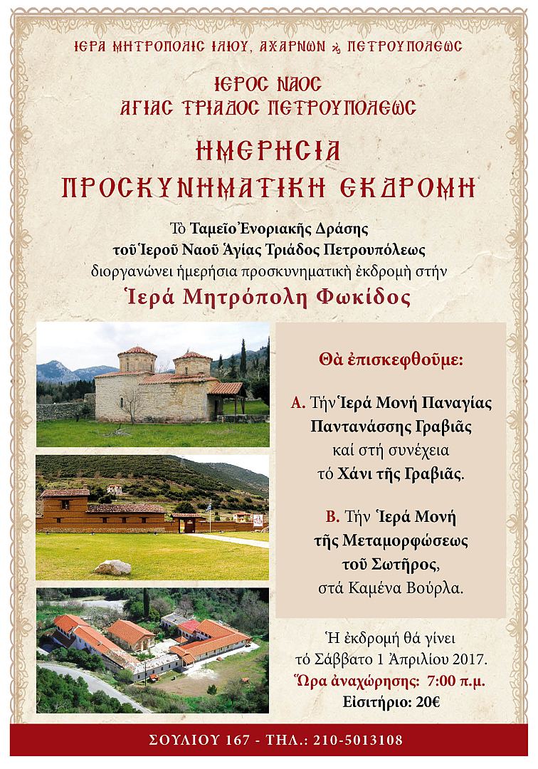 Το Ταμείο Ενοριακής Δράσης του Ι.Ν. Αγίας Τριάδας Πετρουπόλεως διοργανώνει ημερήσια προσκυνηματική εκδρομή στην Ι.Μ. Φωκίδος, το Σάββατο 1 Απριλίου 2017.