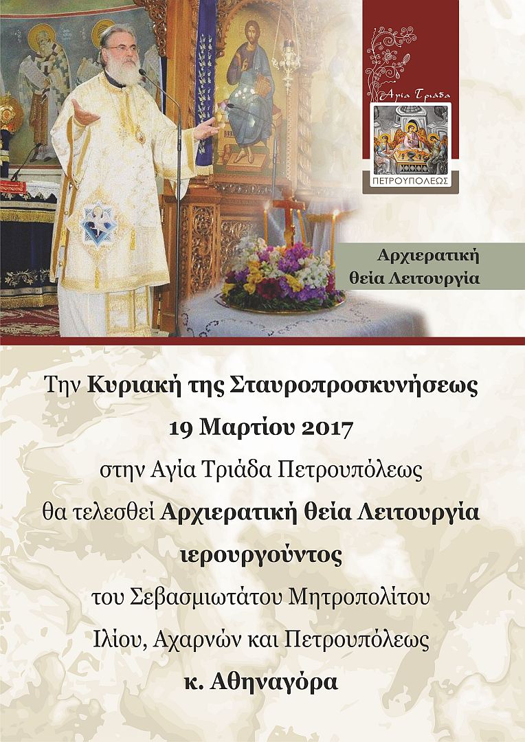 Ο Σεβασμιώτατος Μητροπολίτης Ιλίου, Αχαρνών και Πετρουπόλεως κ. Αθηναγόρας θα λειτουργήσει στον Ιερό Ναό Αγίας Τριάδας Πετρουπόλεως, την Κυριακή της Σταυροπροσκυνήσεως, 19 Μαρτίου 2017.