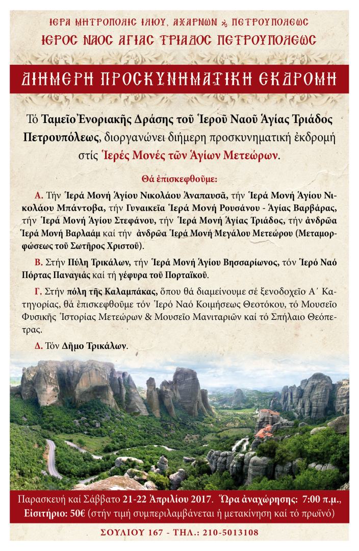 Το Ταμείο Ενοριακής Δράσης του Ιερού Ναού Αγίας Τριάδας Πετρουπόλεως, διοργανώνει διήμερη προσκυνηματική εκδρομή στις Ιερές Μονές των Αγίων Μετεώρων.