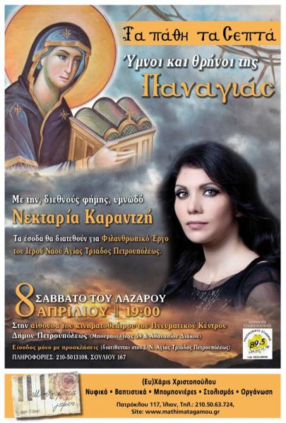 Τὸ Σάββατο τοῦ Λαζάρου 8 Ἀπριλίου 2017 καὶ ὥρα 19:00, στὴν αἴθουσα τοῦ Κινηματοθεάτρου τοῦ Πνευματικοῦ Κέντρου Δήμου Πετρουπόλεως θὰ ἀκουστοῦν ὕμνοι καὶ θρήνοι τῆς Παναγίας, ἀπὸ τὴν διεθνοῦς φήμης, ὑμνωδὸ Νεκταρία Καραντζῆ.