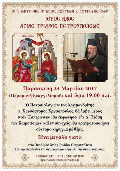 Την Παρασκευή 24 Μαρτίου 2017, στις 19:00, στον Ιερό Ναό Αγίας Τριάδας Πετρουπόλεως, θα τελεστεί ο Εσπερινός του Ευαγγελισμού της Θεοτόκου.