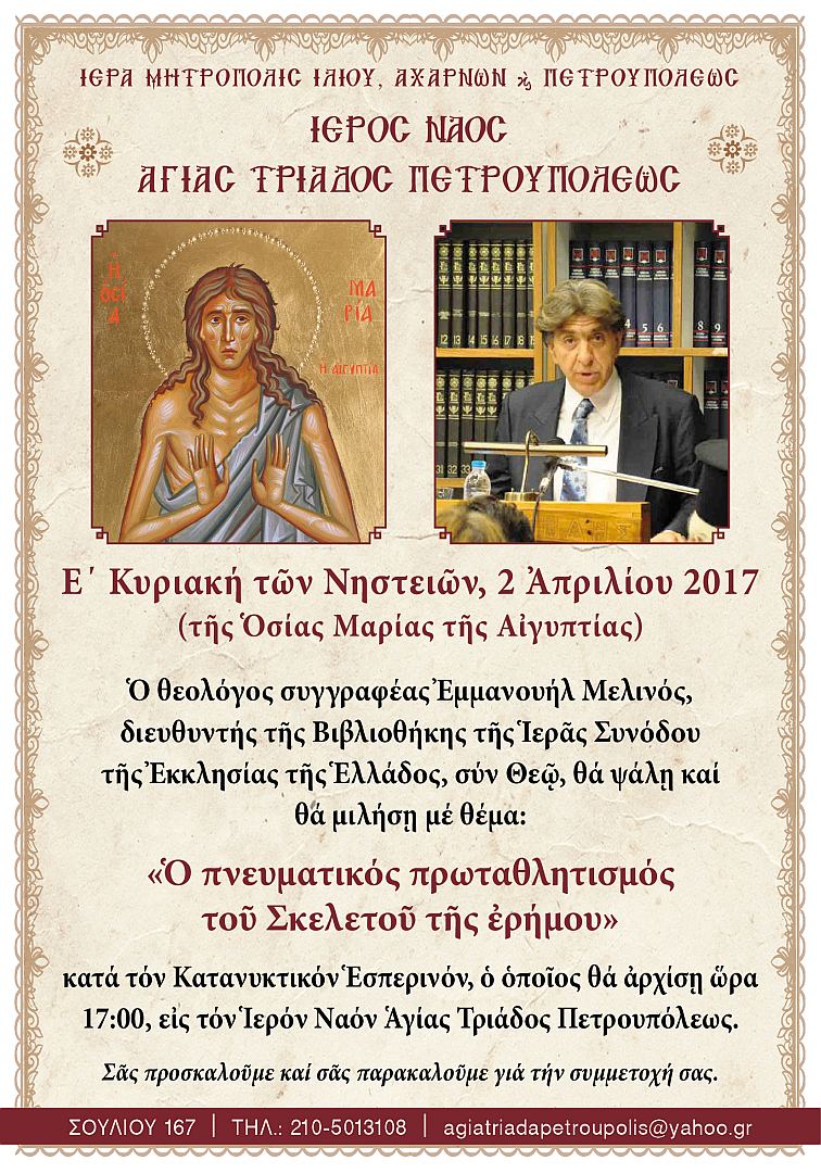 Η ομιλία θα γίνει κατά τον Κατανυκτικό Εσπερινό, την Κυριακή 2 Απριλίου 2017, στις 17:00. Ο κ. Μελινός θα ψάλει κατά τη διάρκεια της ακολουθίας.