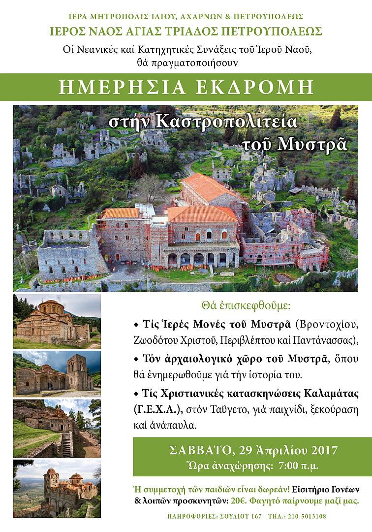 Εκδρομή στις Ιερές Μονές και τον αρχαιολογικό χώρο του Μυστρά θα πραγματοποιήσει η ενορία της Αγίας Τριάδας Πετρουπόλεως.