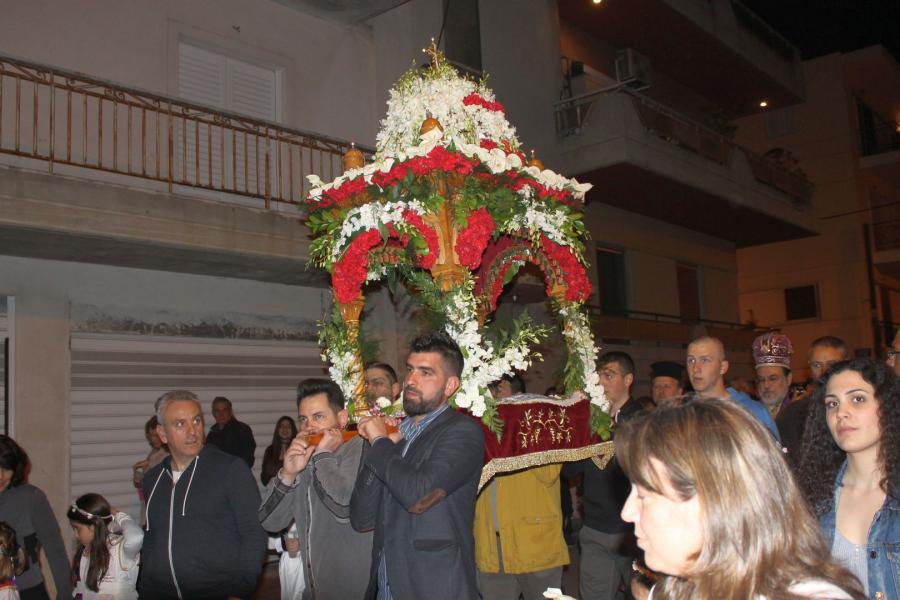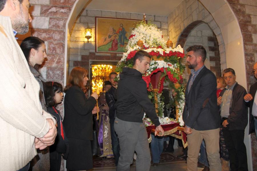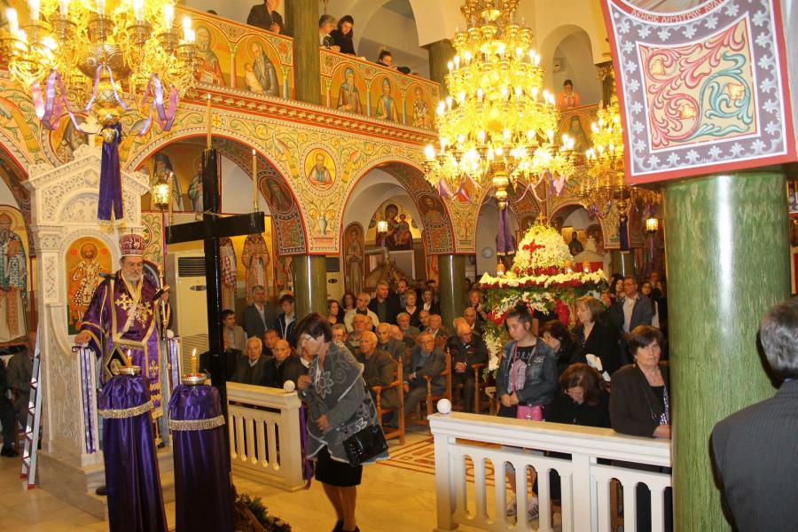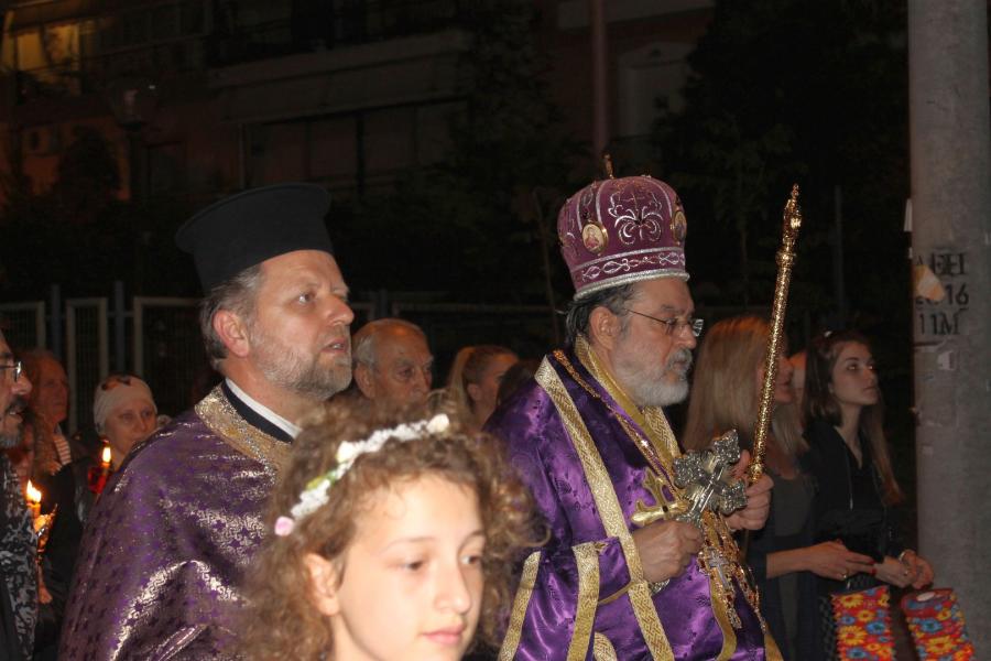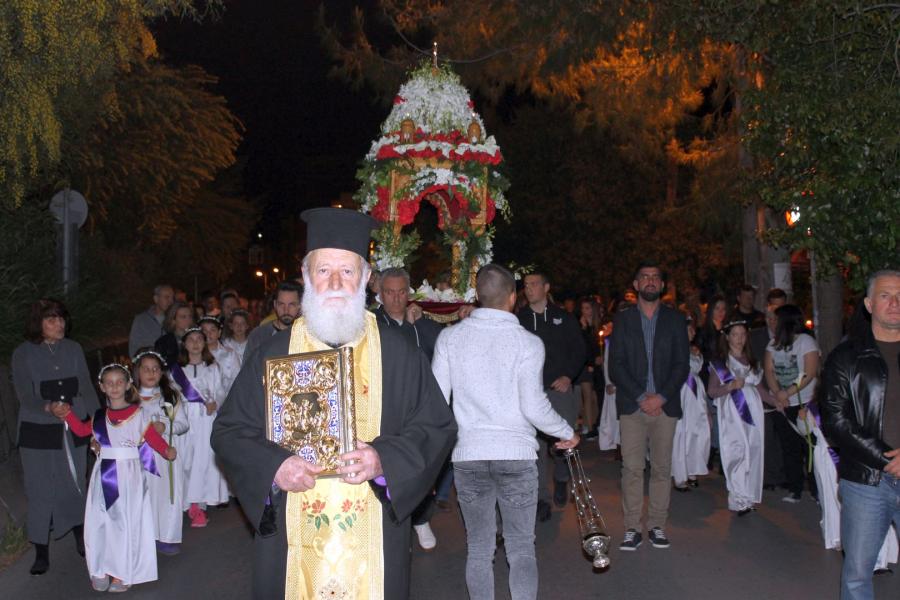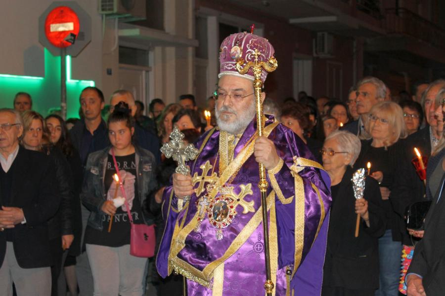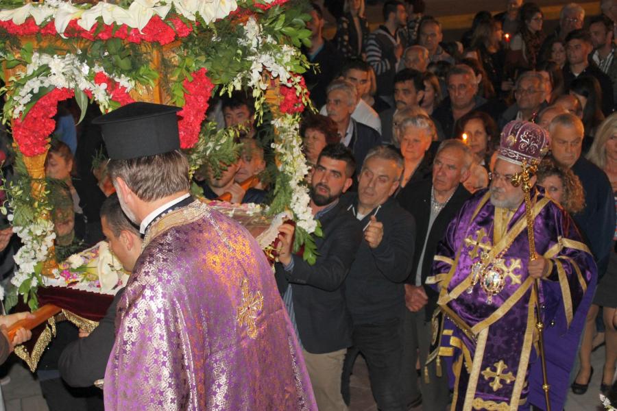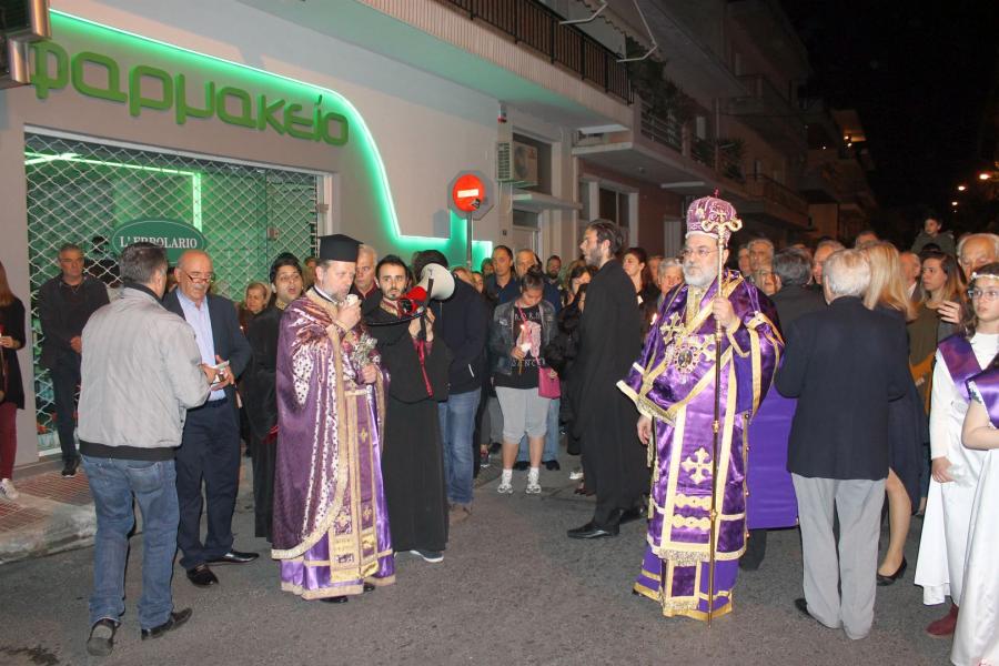 Ο Σεβασμιώτατος αφού χοροστάτησε στην ακολουθία του Επιταφίου, συμπροσευχόμενος μετά του προϊσταμένου του Ιερού Ναού π. Κωνσταντίνου Λαμπρόπουλου και του π. Ηλία Λαμπρόπουλου, λάμπρυνε με την παρουσία του τη λιτανευτική πομπή. Στη συνέχεια και με την επιστροφή στον Ιερό Ναό ο Σεβασμιώτατος εκφώνησε λαμπρό λόγο για την κάθοδο του Κυρίου στον Άδη αλλά και για Αυτόν τον «Ξένον» που ήρθε και έδωσε το αίμα Του προς Σωτηρία του ανθρωπίνου γένους. Τέλος αφού ευχαρίστησε τον π. Κωνσταντίνο και τους ανθρώπους του Ι.Ν., ευχήθηκε στο χριστεπώνυμο ποίμνιο «Καλή Ανάσταση».