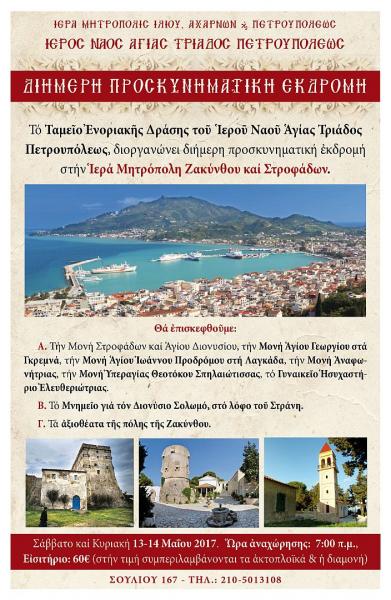 Το Ταμείο Ενοριακής Δράσης του Ι.Ν. Αγ. Τριάδας Πετρουπόλεως, διοργανώνει διήμερη προσκυνηματική εκδρομή στην Ι.Μ. Ζακύνθου και Στροφάδων.