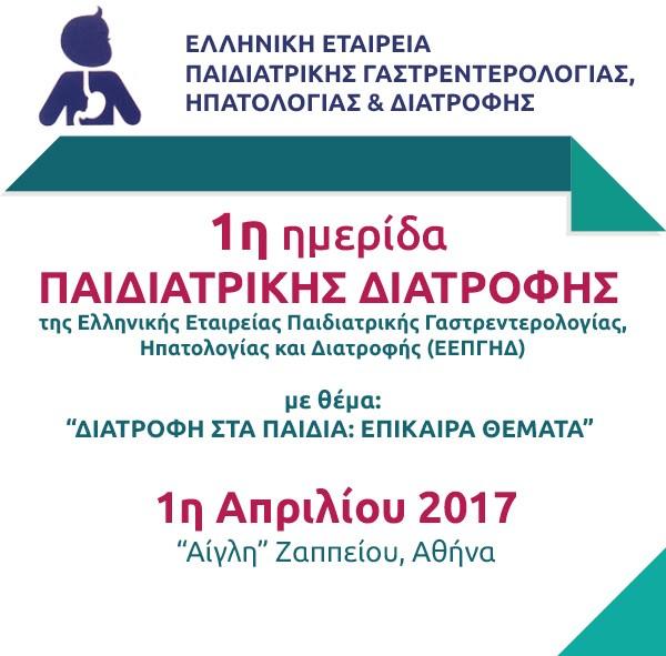 Πραγματοποιήθηκε η 1η Ημερίδα Παιδιατρικής Διατροφής με θέμα: «Διατροφή στα παιδιά: Επίκαιρα θέματα». Η Ημερίδα διοργανώθηκε από την Εταιρεία Παιδιατρικής Γαστρεντερολογίας Ηπατολογίας και Διατροφής και πραγματοποιήθηκε στην Αθήνα 1 Απριλίου 2017.