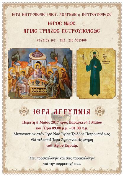 Αγρυπνία θα τελεστεί στον Ι.Ν. Αγίας Τριάδας Πετρουπόλεως την Πέμπτη 4 Μαΐου 2017, από τις 9 το βράδυ μέχρι τη 1 περίπου τα ξημερώματα της Παρασκευής.