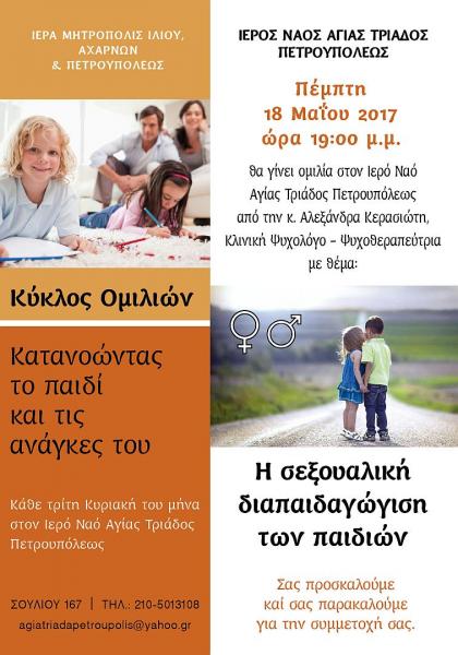 «Η σεξουαλική διαπαιδαγώγιση των παιδιών» είναι το θέμα της ομιλίας της κας Αλεξάνδρας Κερασιώτη, η οποία θα γίνει την Πέμπτη 18 Μαΐου 2017, στις 19:00, στον Ι.Ν. Αγ. Τριάδας Πετρουπόλεως.