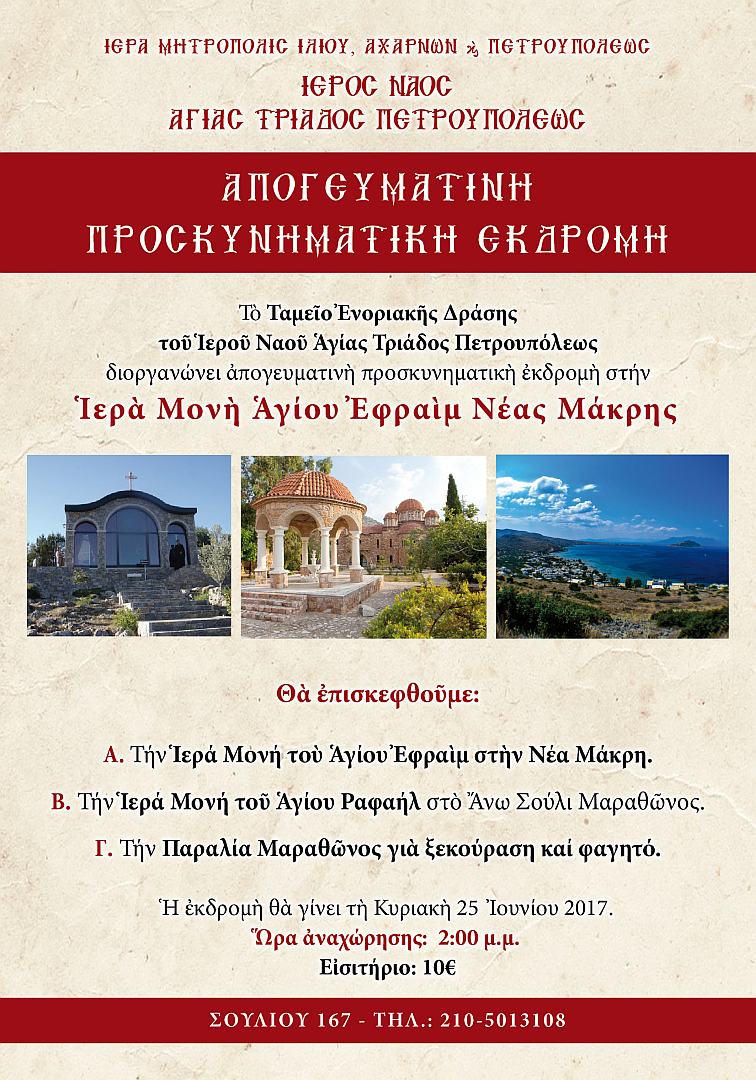 Το Ταμείο Ενοριακής Δράσης του Ι.Ν. Αγίας Τριάδος Πετρουπόλεως διοργανώνει απογευματινή προσκυνηματική εκδρομή στην Ι.Μ. Αγίου Εφραίμ Νέας Μάκρης.