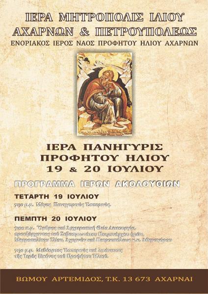 Πανηγυρίζει ο Ιερός Ναός Προφήτου Ηλιού Αχαρνών, στις 19 και 20 Ιουλίου 2017, σύμφωνα με το παρακάτω πρόγραμμα:
