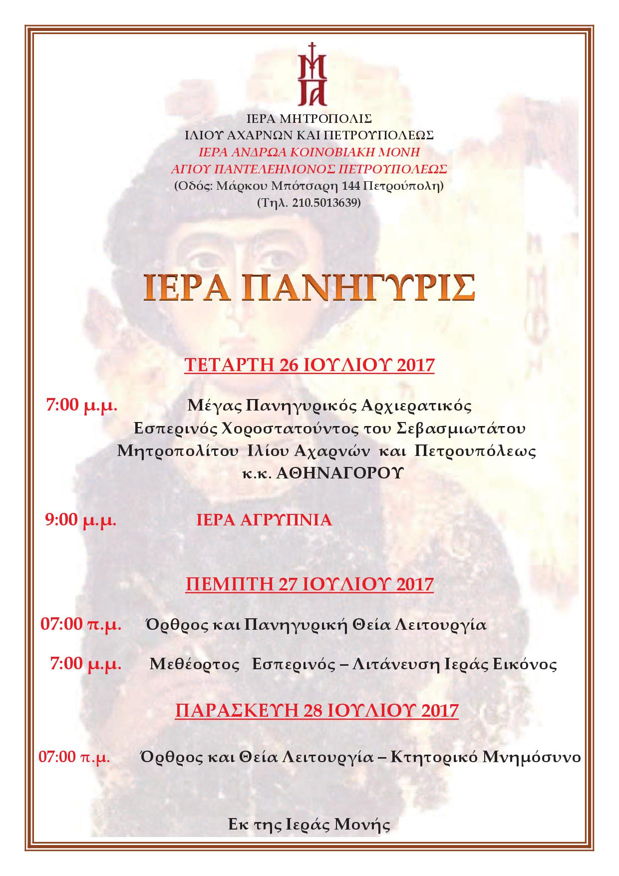 Πανηγυρίζει η ανδρώα Ιερά Μονή Αγίου Παντελεήμονος Πετρουπόλεως, που βρίσκεται στην οδό Μάρκου Μπότσαρη 144, σύμφωνα με το ακόλουθο πρόγραμμα: