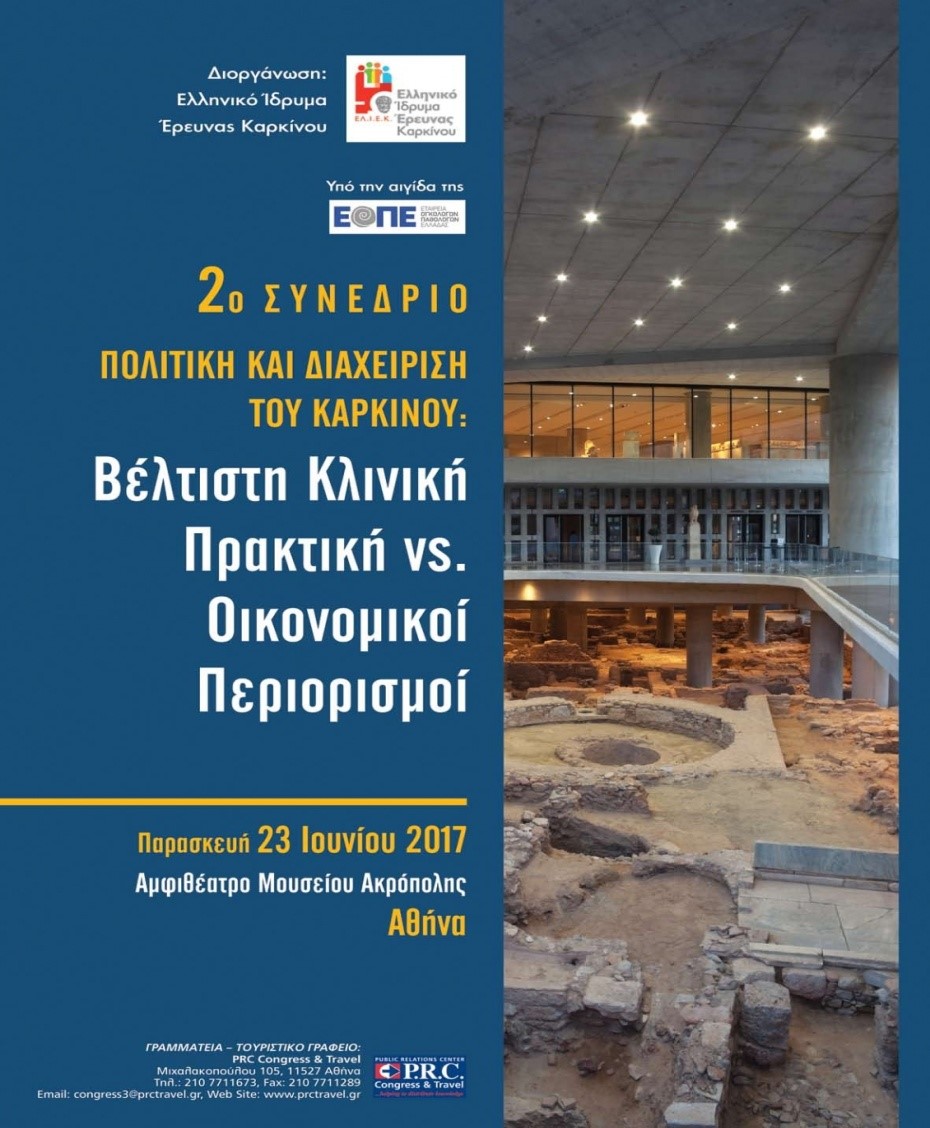 Πραγματοποιήθηκε στις 23 Ιουνίου 2017, στο Αμφιθέατρο του Μουσείου της Ακρόπολης το 2ο ΣΥΝΕΔΡΙΟ «ΠΟΛΙΤΙΚΗ ΚΑΙ ΔΙΑΧΕΙΡΙΣΗ ΤΟΥ ΚΑΡΚΙΝΟΥ: ΒΕΛΤΙΣΤΗ ΠΡΑΚΤΙΚΗ VS. ΟΙΚΟΝΟΜΙΚΟΙ ΠΕΡΙΟΡΙΣΜΟΙ».