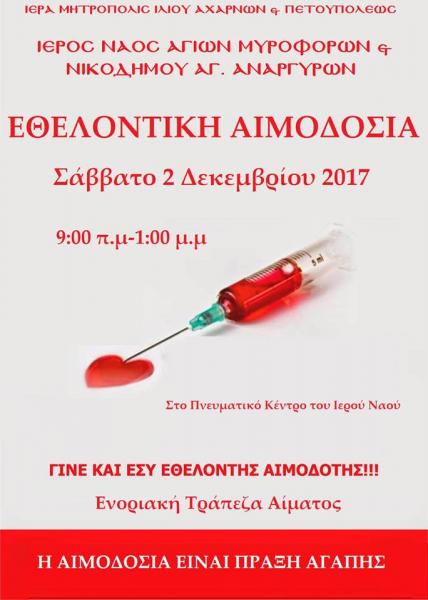 Η αιμοδοσία θα γίνει στο Πνευματικό Κέντρο του Ναού, θα ξεκινήσει στις 9 το πρωί του Σαββάτου 2 Δεκεμβρίου 2017 και θα ολοκληρωθεί στη 1 το μεσημέρι.