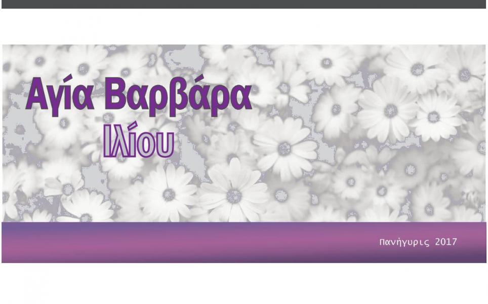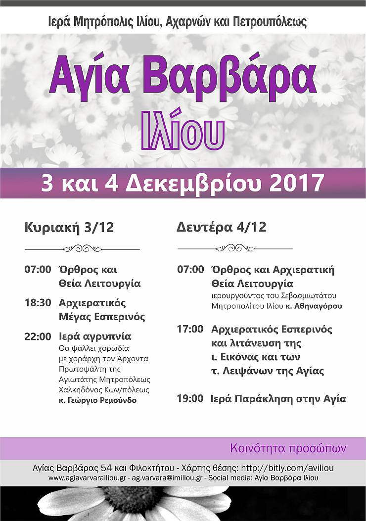 Το διήμερο 3 και 4 Δεκεμβρίου 2017 πανηγυρίζει η ενορία της Αγίας Βαρβάρας Ιλίου τη μνήμη της προστάτιδάς της, στον περικαλλή ναό της.