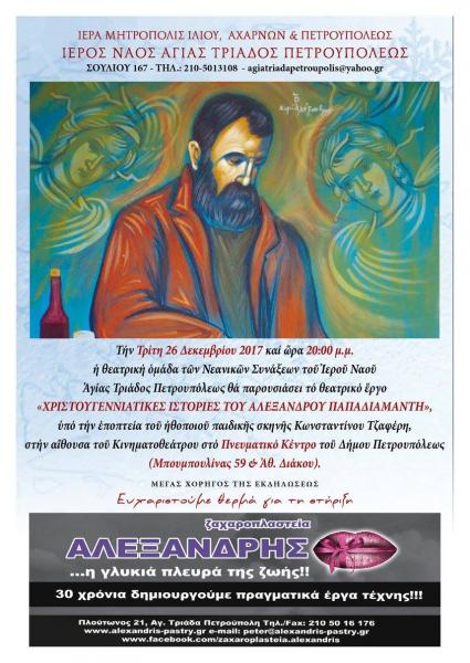 Τα παιδιά θα αποδώσουν τα χριστουγεννιάτικα διηγήματα του Αλέξανδρου Παπαδιαμάντη, σε διασκευή και υπό τη σκηνοθεσία και επίβλεψη του θεολόγου και ηθοποιού κου Κωνσταντίνου Τζαφέρη.