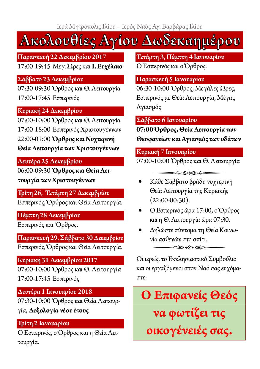 Πρόγραμμα ακολουθιών 12-ημέρου Ι.Ν. Αγ. Βαρβάρας Ιλίου