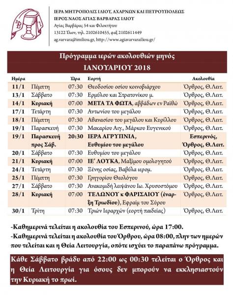 Δείτε το πρόγραμμα των ακολουθιών του Ι.Ν. Αγ. Βαρβάρας Ιλίου για το μήνα Ιανουάριο 2018, μετά το πέρας του Αγίου Δωδεκαημέρου των Χριστουγέννων και Θεοφανείων.