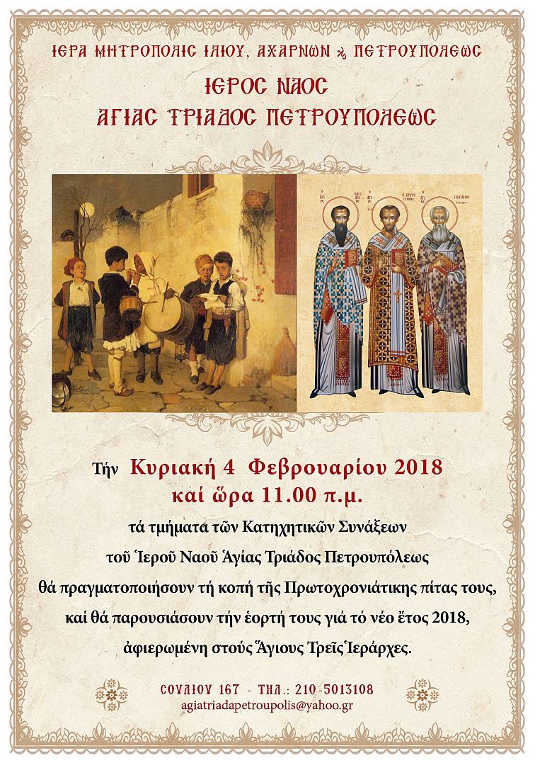 Την Κυριακή 4 Φεβρουαρίου 2018 και ώρα 11:00, τα τμήματα των κατηχητικών συνάξεων του Ι.Ν. Αγ. Τριάδος Πετρουπόλεως θα πραγματοποιήσουν την κοπή της πρωτοχρονιάτικης πίτας τους και θα παρουσιάσουν την αφιερωμένη στους Άγιους Τρεις Ιεράρχες εορτή τους.
