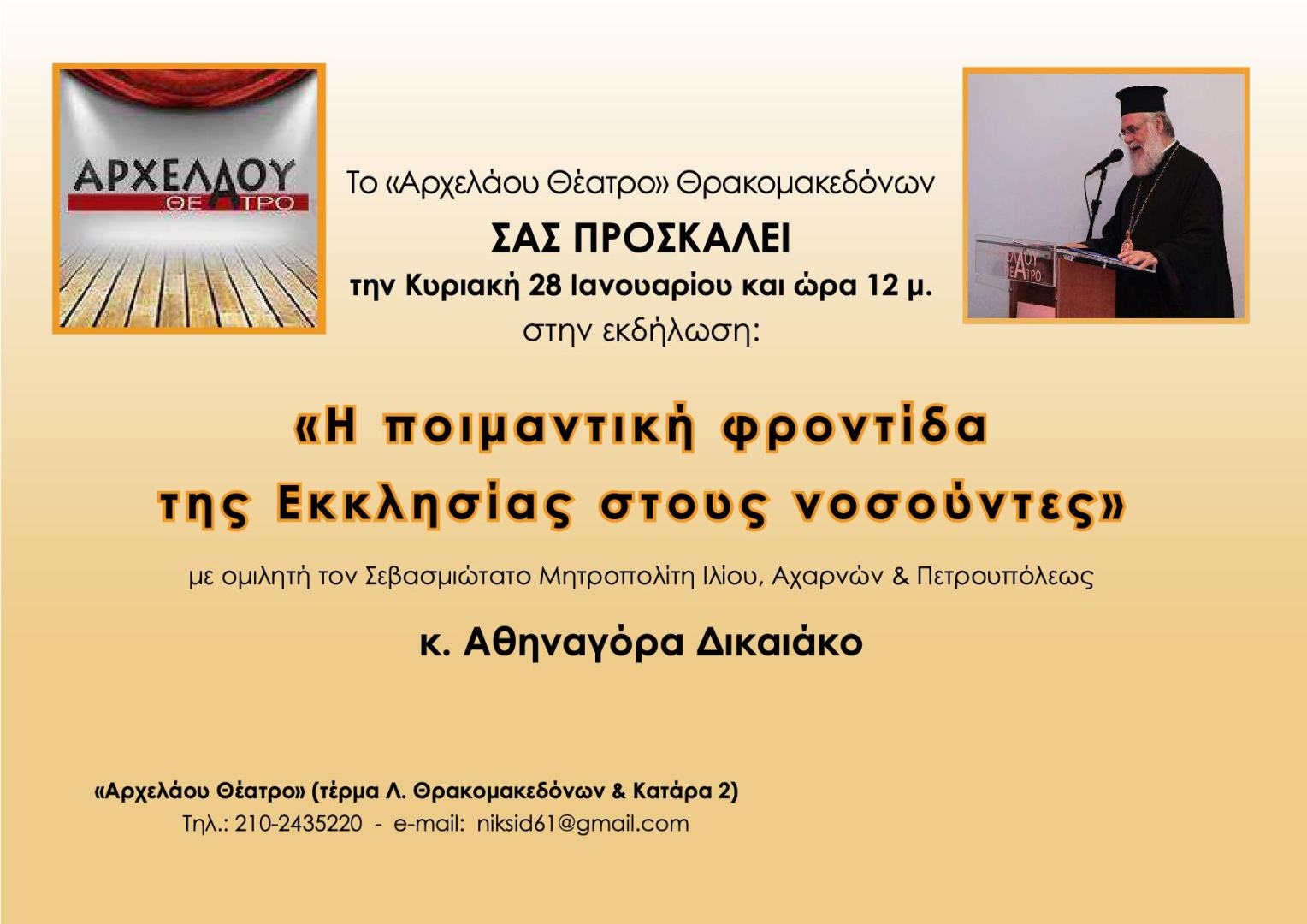 Ο Σεβασμιώτατος Μητροπολίτης Ιλίου, Αχαρνών και Πετρουπόλεως κ. Αθηναγόρας θα ομιλήσει την Κυριακή 28 Ιανουαρίου 2018 και ώρα 12 το μεσημέρι, στο «Αρχελάου Θέατρο» Θρακομακεδόνων με θέμα:
