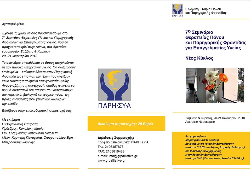 Η Ελληνική Εταιρία Θεραπείας Πόνου και Παρηγορικής Φροντίδας, (ΠΑΡΗ.ΣΥ.Α.) διοργάνωσε το 7ο Σεμινάριο Θεραπείας Πόνου και Παρηγορικής Φροντίδας, το οποίο πραγματοποιήθηκε στην Αθήνα, στο Αρεταίειο νοσοκομείο, το Σάββατο & την Κυριακή, 20 -21 Ιανουαρίου 2018. Το Συνέδριο απευθυνόταν σε όλους τους επαγγελματίες υγείας και παρευρέθηκαν γιατροί διαφόρων ειδικοτήτων, κυρίως όμως εξειδικευμένοι στην αντιμετώπιση του χρόνιου πόνου, νοσηλευτές, ψυχολόγοι, κοινωνικοί λειτουργοί, φυσιοθεραπευτές, εθελοντές κτλ. Επίσης συζητήθηκαν  επιλεγμένα - επίκαιρα θέματα στην Παρηγορική Φροντίδα ως επιστήμη και τέχνη που αγγίζουν κάθε ευαισθητοποιημένο επαγγελματία υγείας.